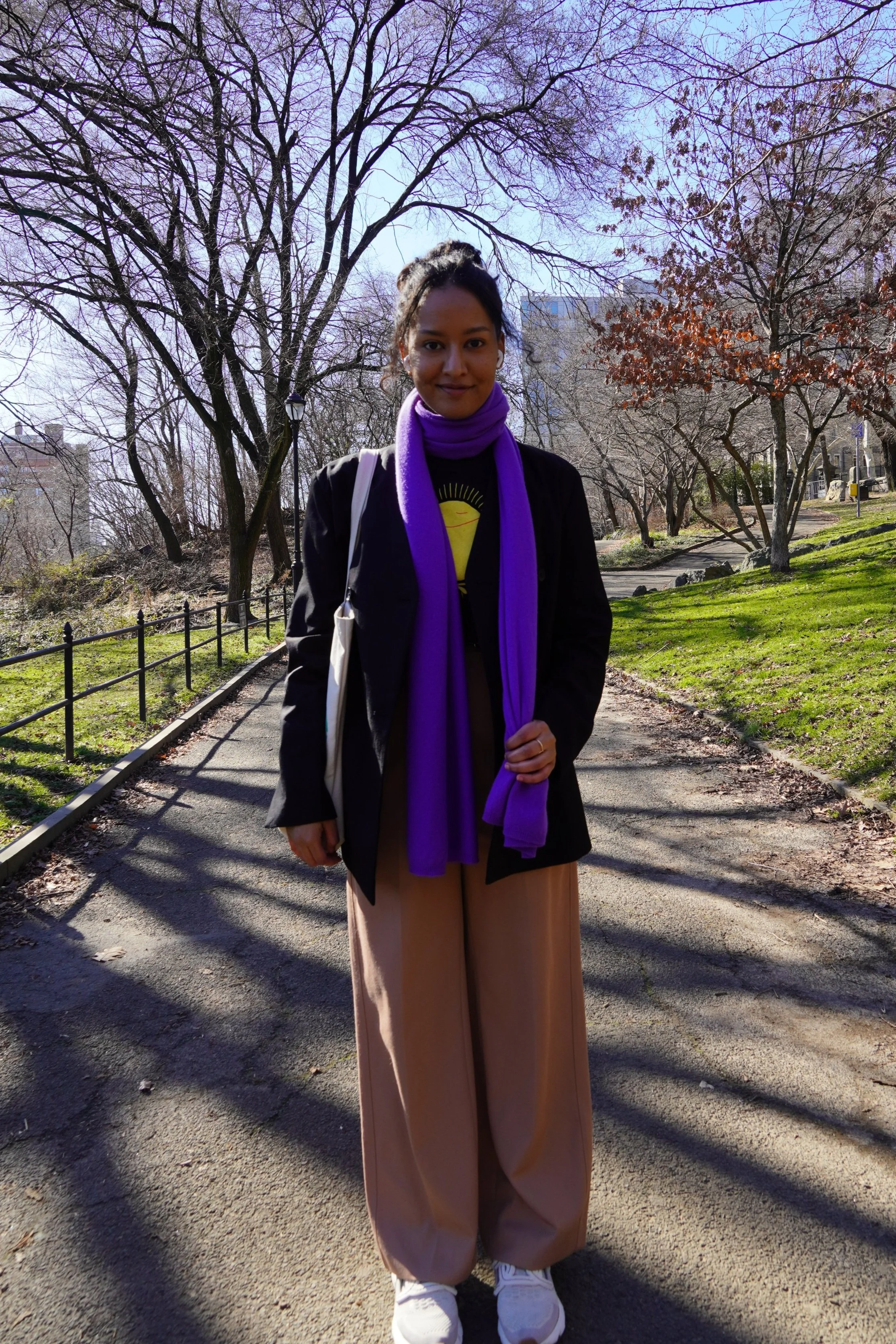 A shot from one of my “failed” solo photoshoots, ha! Scanlan Theodore scarf and trousers. My trusty LouLou Studio blazer and Tod’s sneakers. The T-shirt was a gift from my sweet Mom. The tag says Gildan. The sun looks like the Headspace face, right?